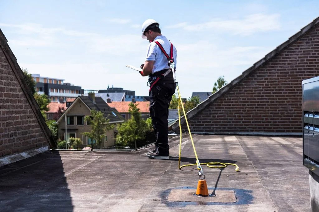 Los postes de extremo y esquina del sistema de línea de vida Twistfix se instalan con cuatro anclajes, mientras que los postes intermedios Twistfix se instalan con solo un anclaje. Impermeabilización con el mismo material de acabado de la cubierta.